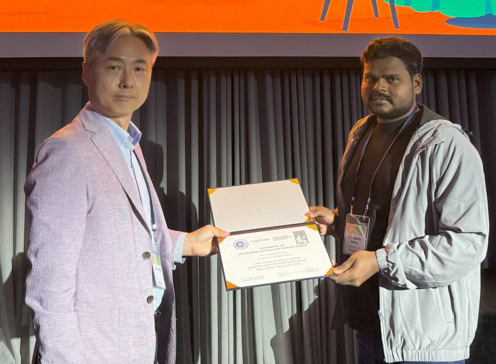 Mr. Anantha Krishna K L, a research scholar under the supervision of Dr K. Guruvidyathri from the School of Engineering Sciences and Technology (SEST), University of Hyderabad, has been awarded the prestigious Larry Kaufman Scholarship at the 52nd international Calphad conference. His presentation was on “Thermodynamic re-assessment of LiCl-GdCl3 molten salt system”.