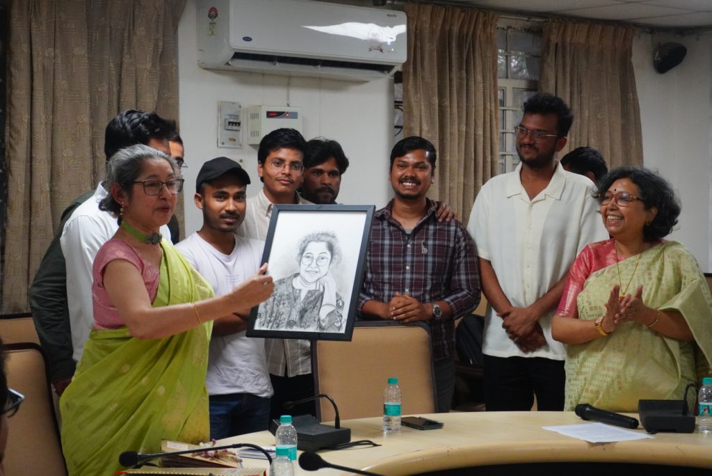 The felicitation ceremony, chaired by Dr. Vijay Ramdas Mandala, formed the emotional culmination of the seminar. As a gesture of gratitude doctoral scholars presented her with a memory scrapbook, while Masters students gifted her a hand-drawn sketch portrait, reflecting their admiration and affection for her as a teacher and mentor. Faculty members and colleagues shared personal reflections on her role as a scholar, administrator, and colleague. Dr. Suchandra Ghosh, Head of the Department, recalled Prof. Mukhopadhyay’s tenure as Head and her lasting institutional contributions. Faculty members including Prof. Sujith Kumar Parayil, Dr. Vijay Ramdas Mandala, Dr. V. J. Varghese, Prof. Bhangya Bhukya, and Dr. Eswar Rao fondly recollected their experiences with her and applauded her intellectual curiosity, critical rigour, and the warmth she consistently extended to students and colleagues.