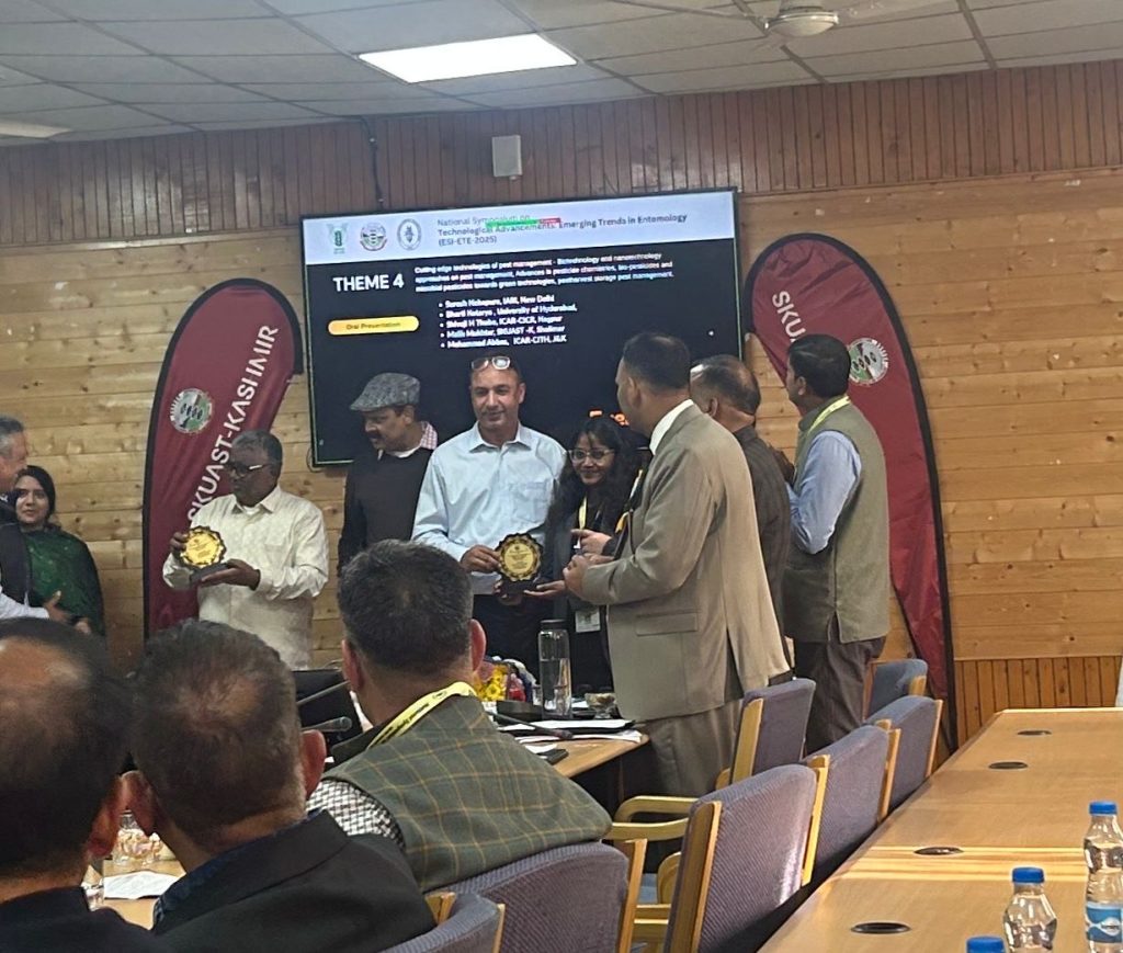 Bharti Kotarya, a PMRF Fellow and Ph.D. scholar, working under the supervision of Prof. K.P.M.S.V. Padmasree, at the Department of Biotechnology and Bioinformatics, School of Life Sciences, University of Hyderabad (UoH), presented her research work at the National Symposium on Technological Advancements: Emerging Trends in Entomology, held from October 08–09, 2025, and organized by the Division of Entomology, Sher-e-Kashmir University of Agricultural Sciences and Technology of Kashmir (SKUAST-K), Srinagar, in collaboration with the Entomological Society of India (ESI).