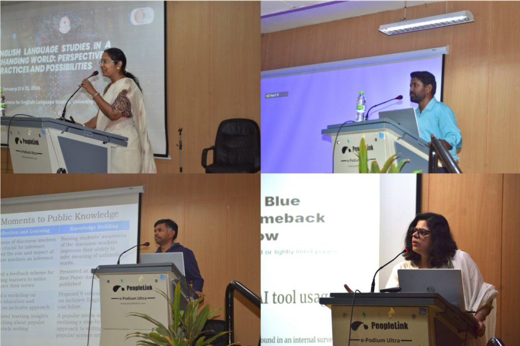 The fifth edition of the Conference for Research Scholars in English Language (COREL), sponsored by the Institute of Eminence, was convened on 21 and 22 January 2026. The two-day conference, thematically centred on ‘English Language Studies in a Changing World: Perspectives, Practices and Possibilities’, was organized by the Research Scholars’ Forum under the purview of the Centre for English Language Studies. The conference was kickstarted with a pre-conference workshop on 20 January 2026. Prof. Lina Mukhopadhyay, Professor, The English and Foreign Languages University, Hyderabad, led a session on ‘Quantitative Data Analysis for Instructed Second Language Acquisition and Learning’ while Dr. Vennela, Assistant Professor, National Institute of Technology, Warangal, conducted a session on ‘Qualitative Research Methods in English Language Studies.’ Both sessions offered hands-on engagement with quantitative and qualitative research methods grounded in theory.