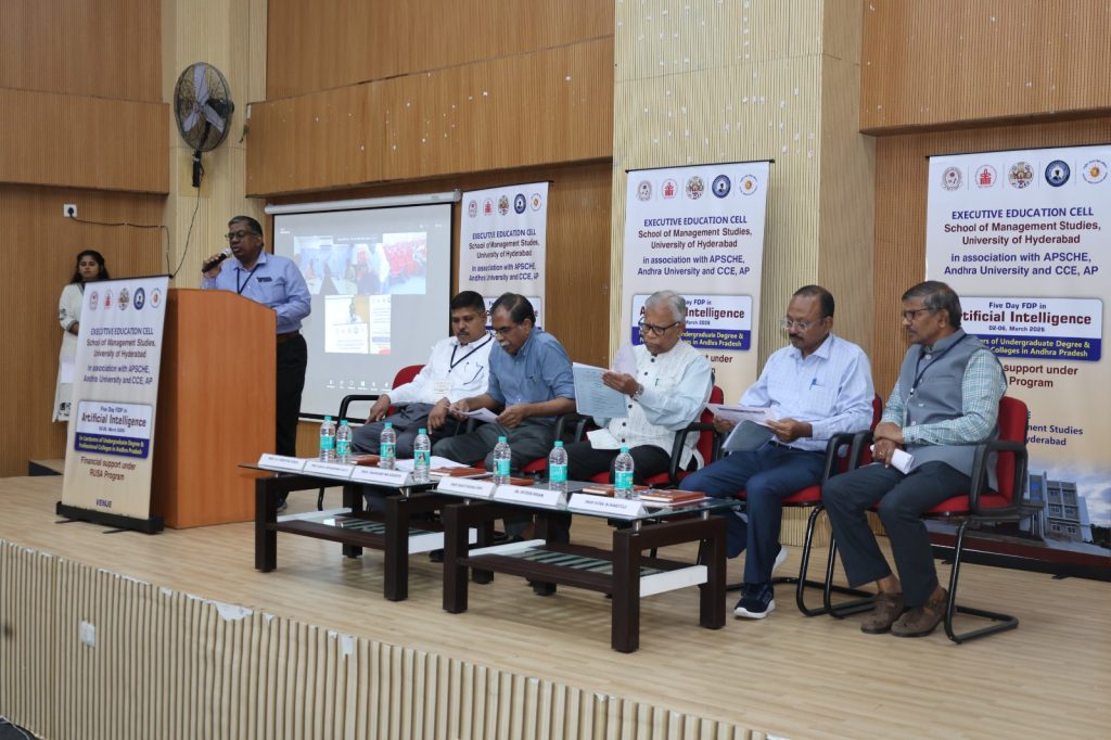 A Five-Day Faculty Development Programme (FDP) on Artificial Intelligence was inaugurated at the University of Hyderabad (UoH) under the aegis of the Executive Education Cell, School of Management Studies, in association with Andhra Pradesh State Council of Higher Education (APSCHE), Andhra University, Visakhapatnam, and the Commissionerate of Collegiate Education (CCE), Government of Andhra Pradesh.