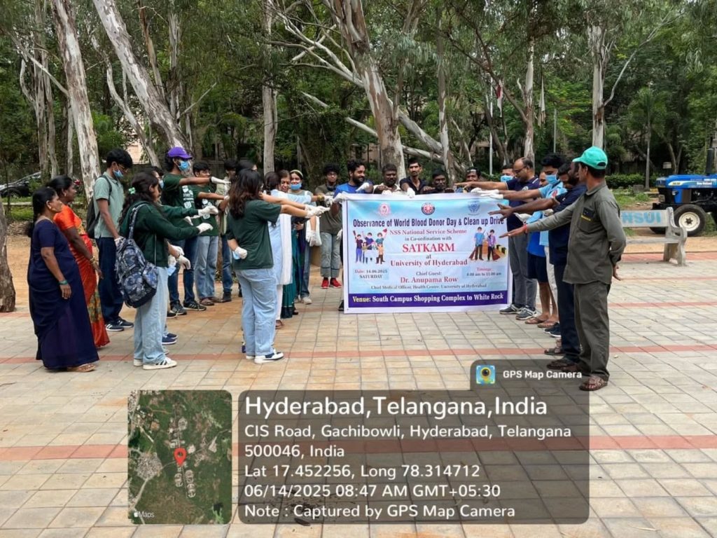 The NSS Cell, University of Hyderabad (UoH), in collaboration with Satkarm, a voluntary organization, organized a meaningful event to observe World Blood Donor Day and Green Udaan Clean-up Drive on June 14, 2025. The event aimed to raise awareness about the importance of blood donation and promote environmental sustainability.