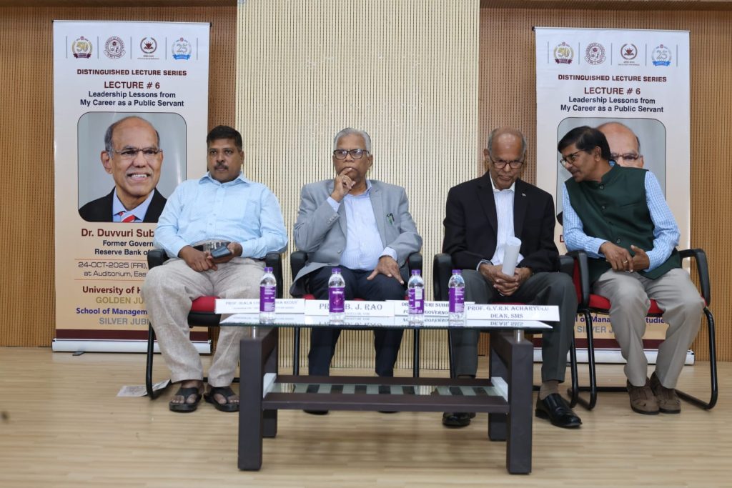 Dr. Duvvuri Subbarao, Former Governor, reserve bank of India delivered the 6th Lecture on the topic: “Leadership Lessons from my career as a public servant”, as part of the University Golden Jubilee & SMS Silver Jubilee Distinguished Lecture Series on 24-October-2025 at the School of Management studies central seminar hall, east campus.