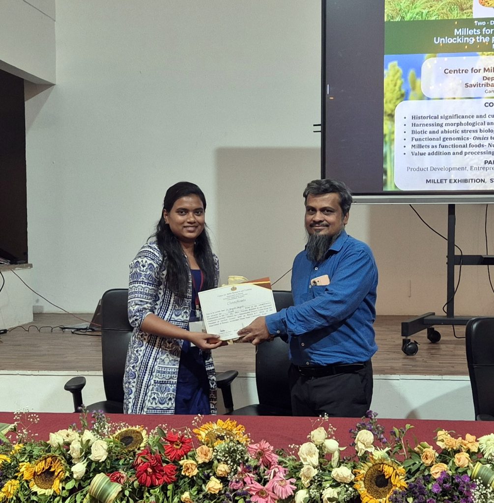 Two M.Sc. students from the Department of Plant Sciences, School of Life Sciences, University of Hyderabad, brought laurels to the University by winning Best Poster Awards at a two-day National Conference on “Millets for a Sustainable Future: Unlocking the Potential of Ancient Grains” held at Savitribai Phule Pune University, Pune, Maharashtra, during March 6-7, 2026.