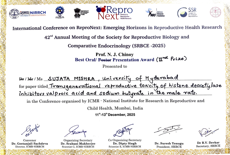 We are pleased to announce that Sujata Mishra, a doctoral student at the Department of Animal Biology, University of Hyderabad, has received the “N.J. Chinoy” best oral presentation award at the 42nd Annual Meeting of the Society for Reproductive Biology and Comparative Endocrinology, held in Mumbai.