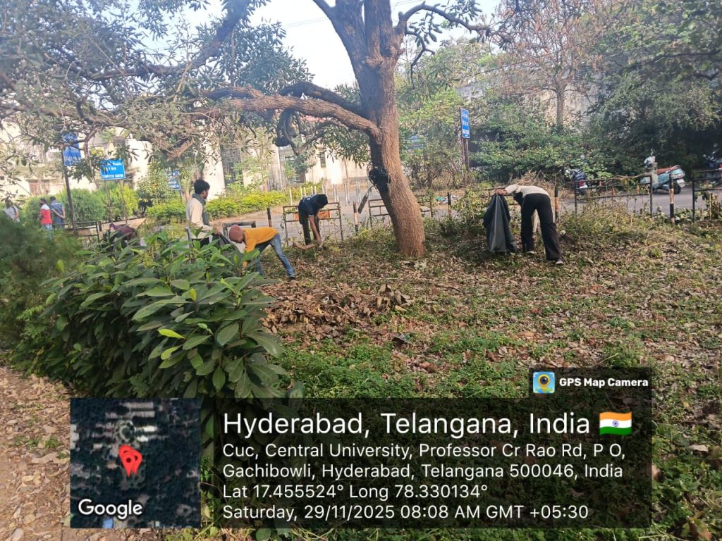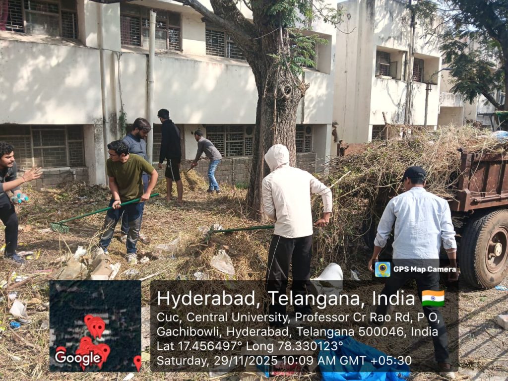 The NSS Cell of the University of Hyderabad (UoH) organized a cleanup drive on the premises of the School of Medical Sciences on November 29, 2025, in collaboration with the horticulture and sanitation departments.
