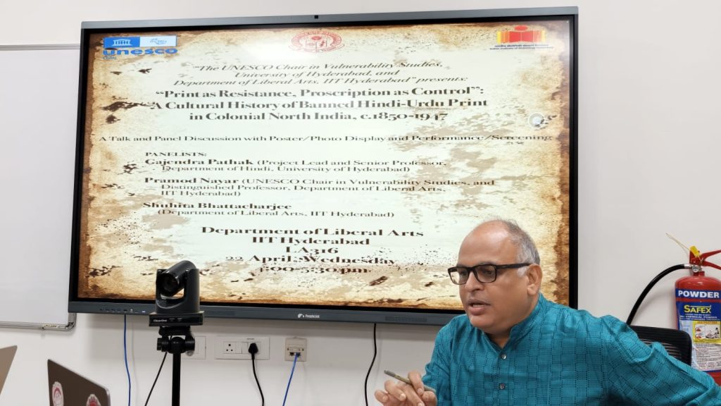 The UNESCO Chair in Vulnerability Studies in collaboration with the Public Humanities initiative of the Department of Liberal Arts, IIT Hyderabad, hosted an exhibition cum talk and panel discussion on ‘ “Print as Resistance, Proscription as Control: A Cultural History of Banned Hindi-Urdu Print in Colonial India, c. 1850-1947” on 22 April 2026 in IIT. This project was originally executed under the IoE by Gajendra Pathak, Senior Professor, Department of Hindi and Professor Ravikant of CSDS.