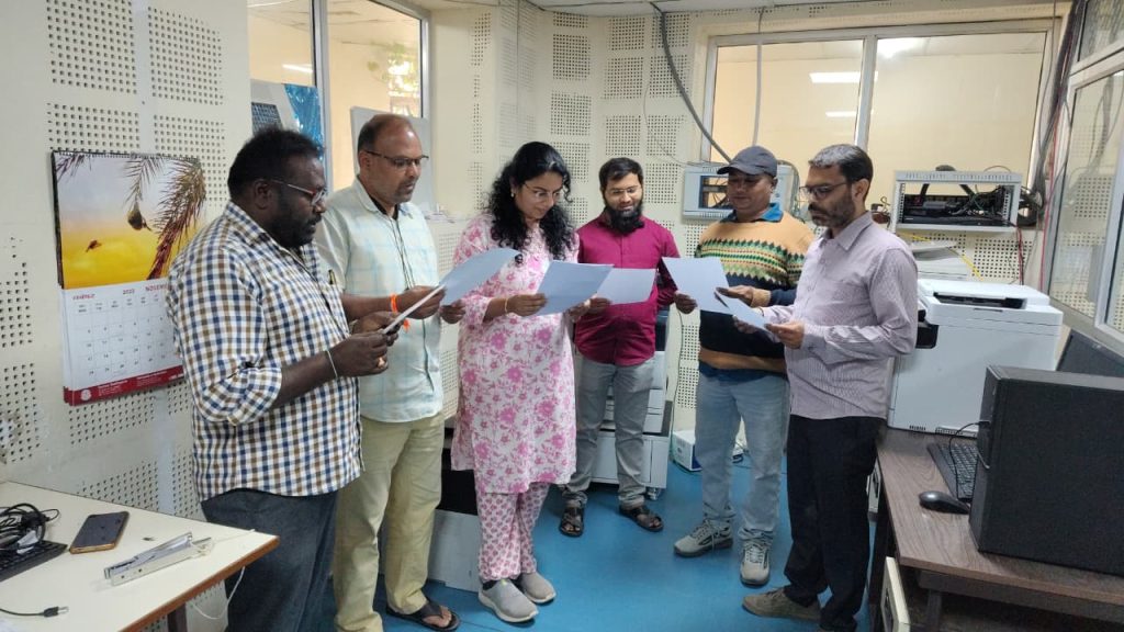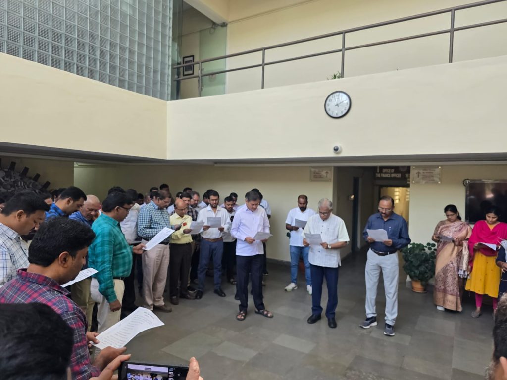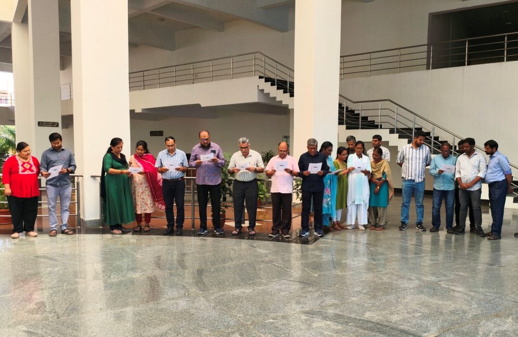 The 76th Constitution Day, or ‘Samvidhan Divas’ was observed on 26-11-2025 at the University of Hyderabad, wherein Dr. Devesh Nigam, Registrar read out the Preamble in Hindi and Prof. BJ Rao, Vice Chancellor read out in English along with the gathering of the university fraternity in the foyer of the administration building.
