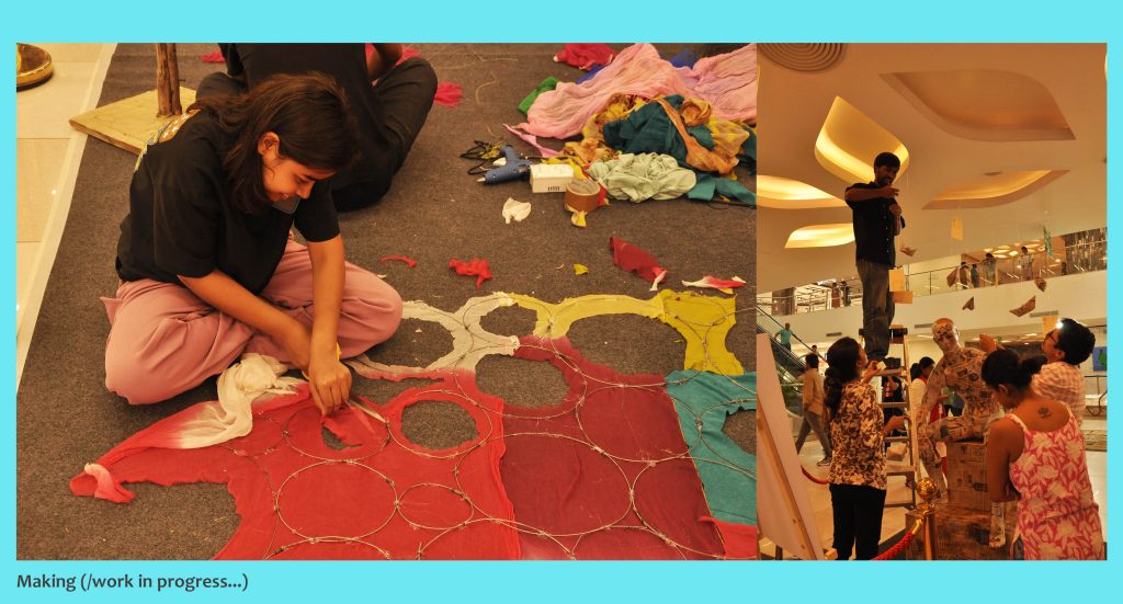The students from these three colleges came up with exciting installations that immediately attracted the attention of adults and children alike. Total 19 students from the Department of Fine Arts, S. N. School from University of Hyderabad came up with four engaging and interactive installations. Below is a short summary of the thought and idea that went behind their work.