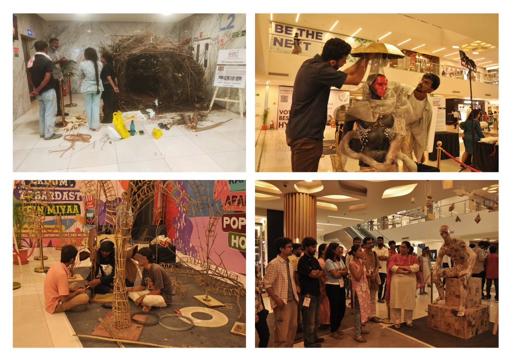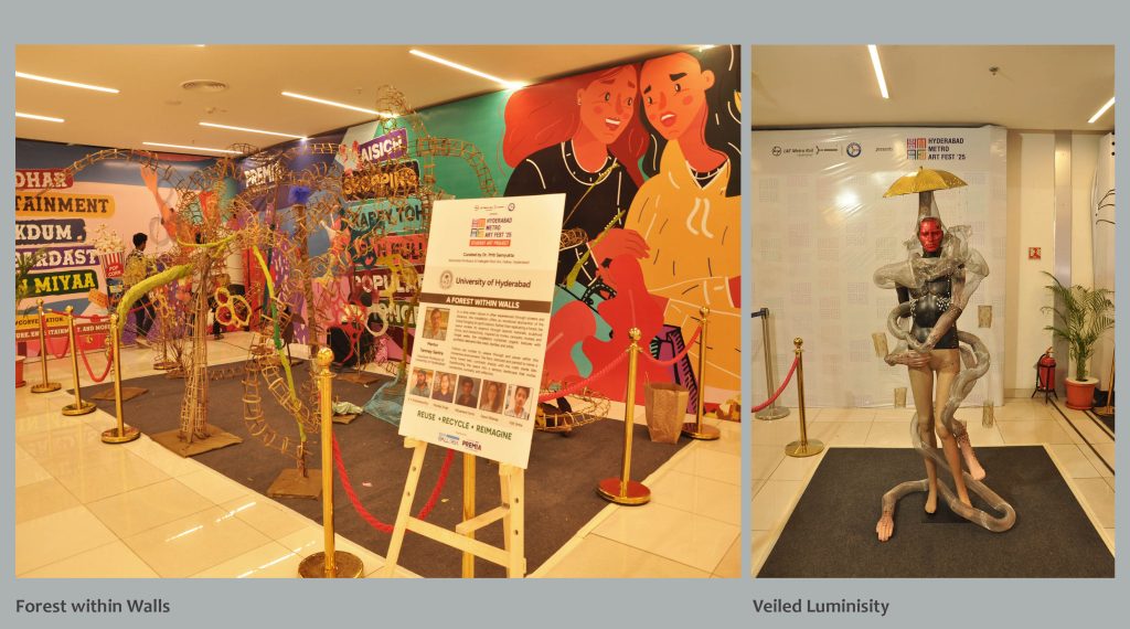 As a part of ‘Hyderabad Metro Art Fest ’25’, IGA Galleria and L&T Metro Rail Hyderabad organized and hosted the ‘Students Art Project’ at the Next Premia Mall, Irrum Manzil, Hyderabad, from the 31st July to the 3rd August 2025. Total forty students from three reputed art institutions of the city are participating in this event to create 10 live art installations using found and discarded materials. The event offered a conceptually engaging and visually impactful artistic environment that engaged viewers to reflect on various themes and different modes of art making. During these four days the event provided a platform where the common public of different age groups and backgrounds got the opportunity to witness the process of art making and interact with art students, the curator and mentors.