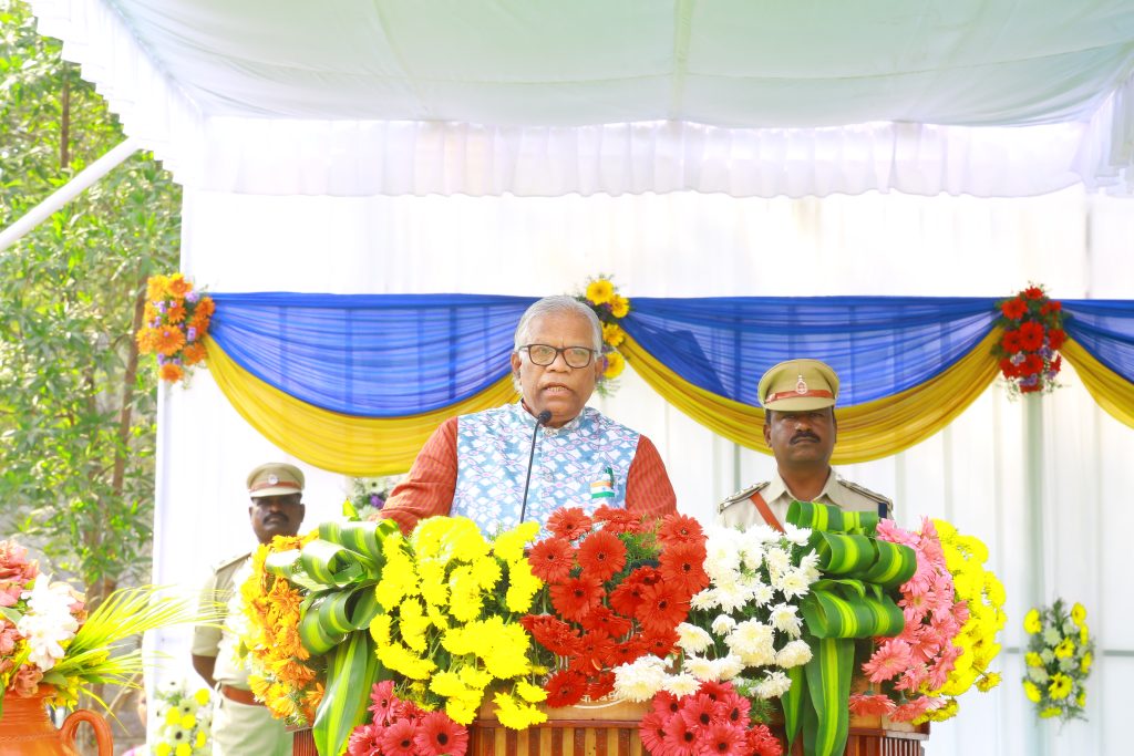 The University of Hyderabad celebrated the 77th Republic Day of India with solemnity and patriotic spirit on campus. The celebrations began with the unfurling of the National Flag by Vice Chancellor, Prof. B. J. Rao accompanied by the University Registrar, Dr. Devesh Nigam followed by the National Anthem, in the presence of faculty members, officers, staff, students, alumni, and their families.