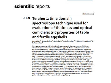 The Terahertz (THz) Research Group at the University of Hyderabad, led by Senior Professor Anil Kumar Chaudhary and Naveen Kumar Periketi (SRF, DIA-CoE, School of Physics), in collaboration with Ms. Iram Juveria and Prof. Aleem Basha (Maulana Azad National Urdu University), Dr. K. A. Jaleeli (Nizam College, Osmania University), and Dr. R. Purshotham (Department of Poultry Science, P.V.N.R. Telangana Veterinary University), has developed a novel, non-destructive terahertz spectroscopy-based technique for characterizing table and fertile eggshells.