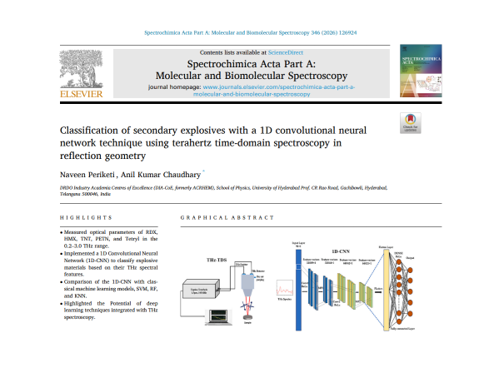 In continuation, the research group led by Prof. A. K. Chaudhary along with Naveen Periketi (SRF), has made a significant advancement in the field of explosive material characterization by applying a one-dimensional convolutional neural network (1D-CNN) model to terahertz spectroscopic data. Their study focuses on the identification and classification of secondary explosive samples using terahertz time-domain spectroscopy (THz-TDS) performed in reflection geometry, a non-destructive technique that captures subtle spectral variations associated with molecular structure and composition.